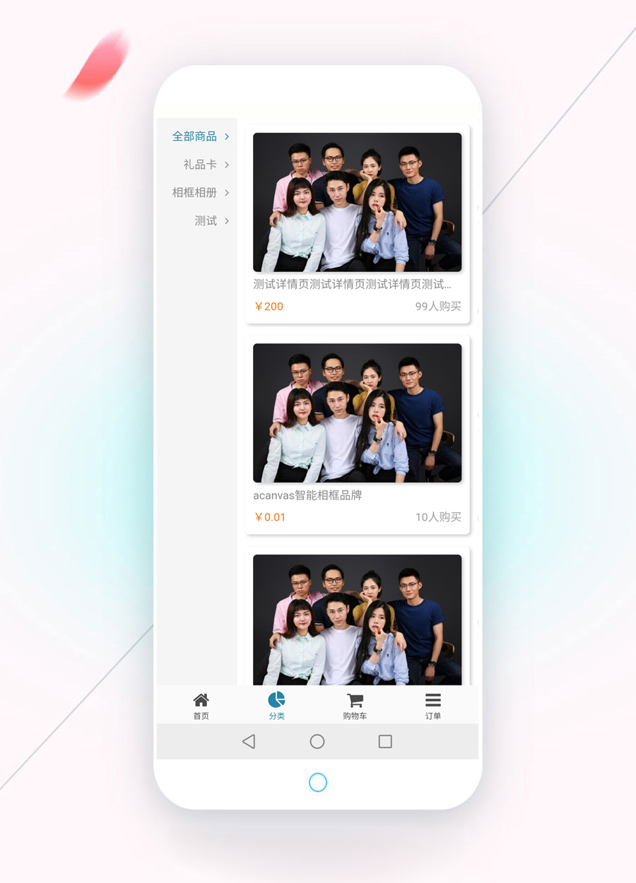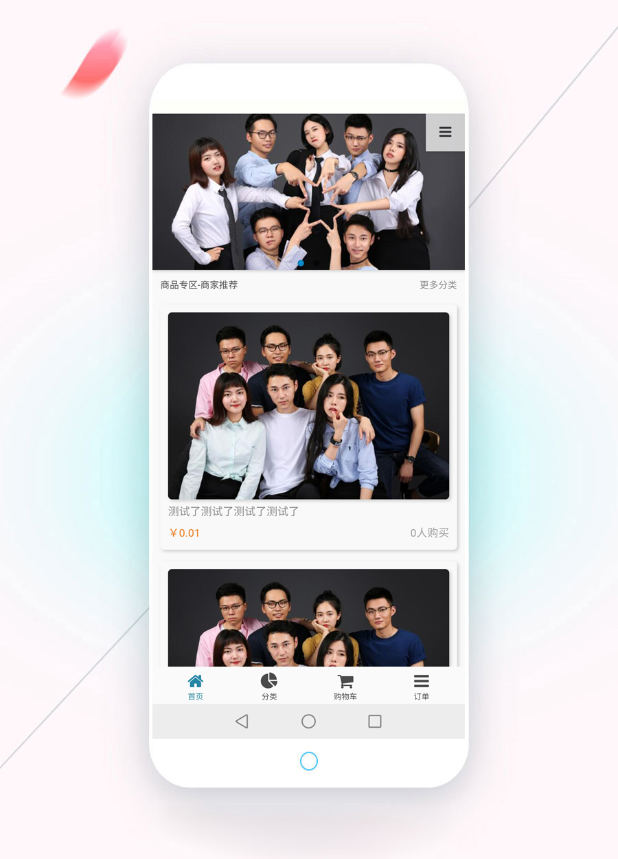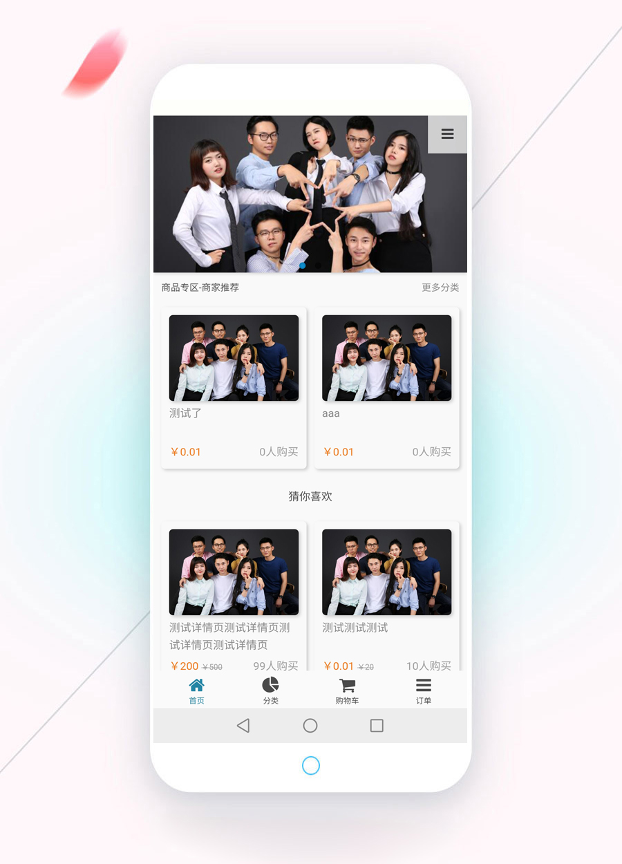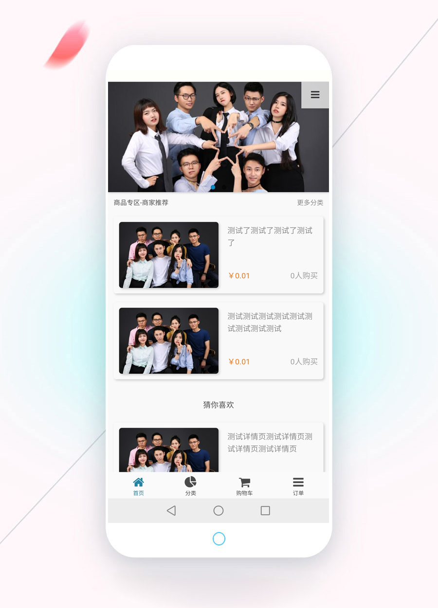 以上是首頁,首頁樣式有多種,可設置列數、圖片邊框、圖片圓角,圖片陰影、列表邊框、列表圓角、列表陰影,商城推薦產品展示、【猜你喜歡】可選開啟,采用下拉刷出產品。
