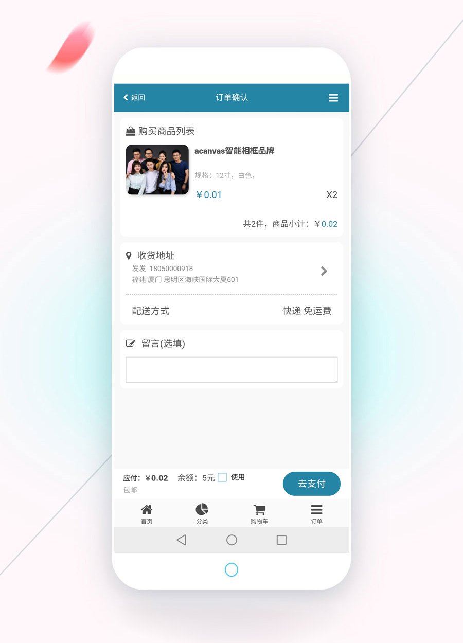以上是訂單確認頁,自動識別是否需要設置收貨地址。可留言。若用戶有余額可使用余額支付。