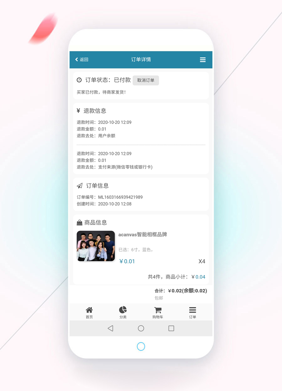 [新增]訂單展示頁新增加了退款記錄,除了用戶取消訂單根據規則退訂金外,新增了后臺手動退款給客戶。可多次退款,退款至余額或者微信支付來源。