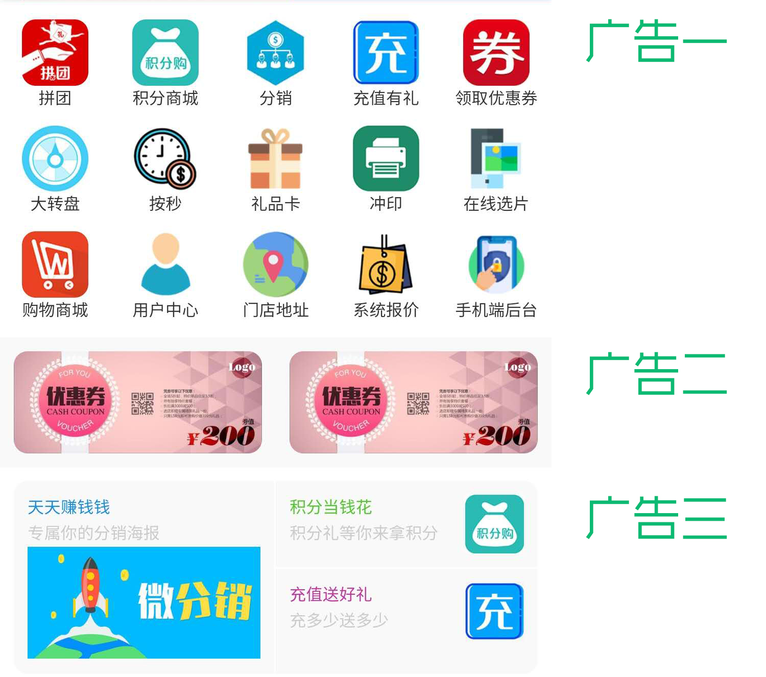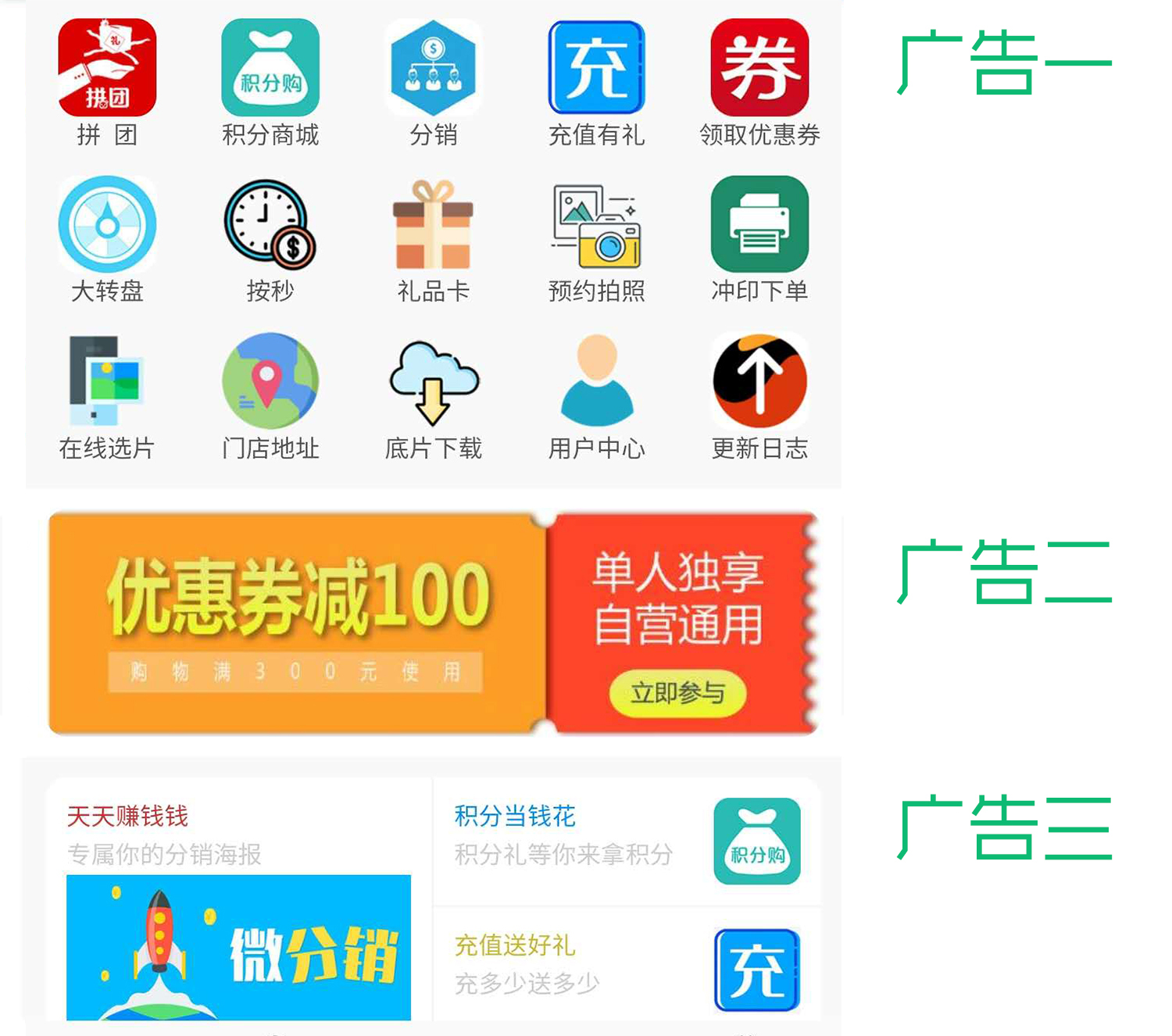 查看演示可掃以下二維碼關(guān)注公眾號 本次更新以下內(nèi)容: 廣告一:可自定義列數(shù)、圖標(biāo),內(nèi)置兩種圖標(biāo)。 廣告一:可自定義列數(shù)、圖標(biāo),內(nèi)置兩種圖標(biāo)。 用戶中心目前四種樣式,兩種內(nèi)置,兩種自定義。 咨詢預(yù)約類系統(tǒng)(可定制開發(fā)各行業(yè),如旅游帶團(tuán)、健身房、教育課程、美業(yè)預(yù)約等)、選片系統(tǒng),可聯(lián)系: |