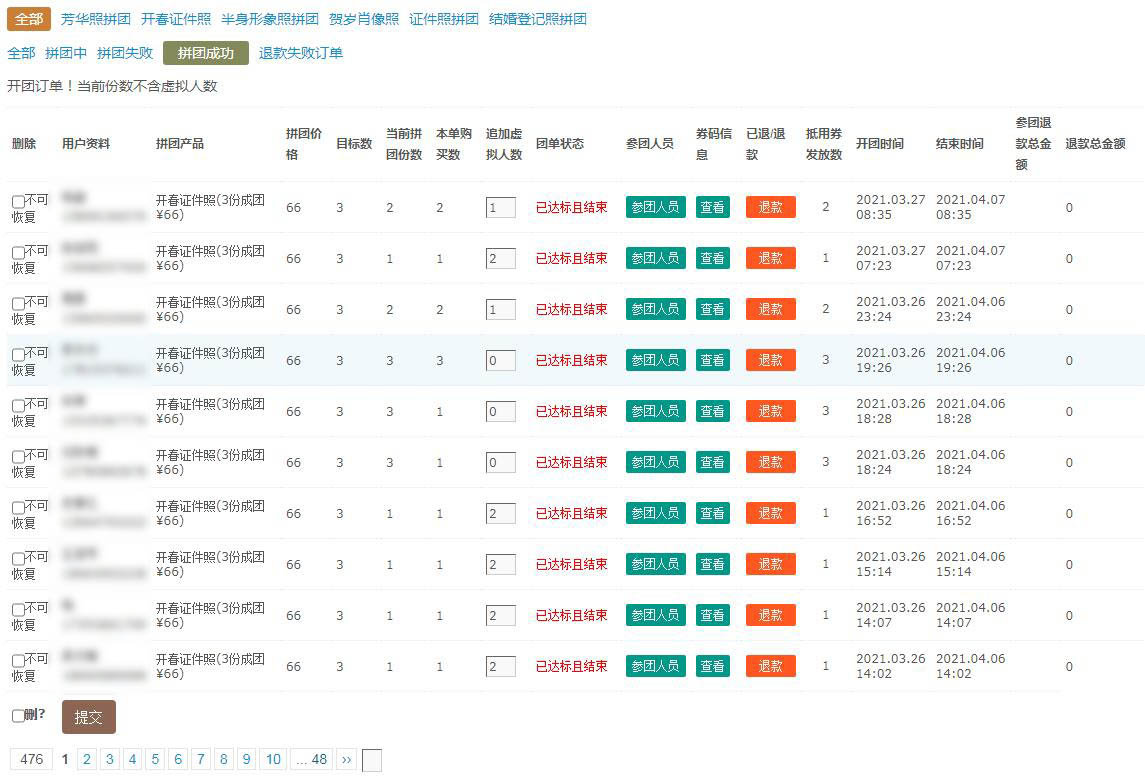 | 盟百開發(fā)的照相館預(yù)約系統(tǒng)拼團工具已經(jīng)推出近兩年,多家照相館用拼團工具取得很不錯的效果。 多級拼團是利用較低的價格引誘顧客主動發(fā)起并分享,以增加銷量和新用戶。 那么盟百開發(fā)的拼團工具有哪里特點呢? 1、可以設(shè)置多個拼團的價格,比如證件照原價99元,三個成團的話價格89元,五人成團的價格69元。 2、全程自動化,拼團數(shù)量成功系統(tǒng)自動發(fā)放拼團優(yōu)惠券且發(fā)送給顧客微信拼團成功通知,拼團失敗系統(tǒng)自動退款且發(fā)送給顧客微信拼團失敗通知。 3、可設(shè)置追加虛擬人數(shù),比如五人成團但只要4人拼團,管理員可在手機端或者電腦端追加虛擬人數(shù),如1人, 這個就可以馬上拼團成功。 4、拼團成功生成拼團券,用戶只需要在預(yù)約檔期的最后一步使用拼團券即可。 |