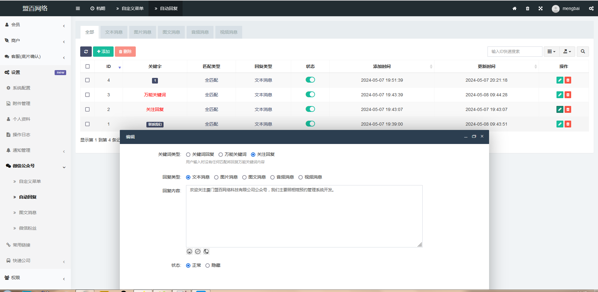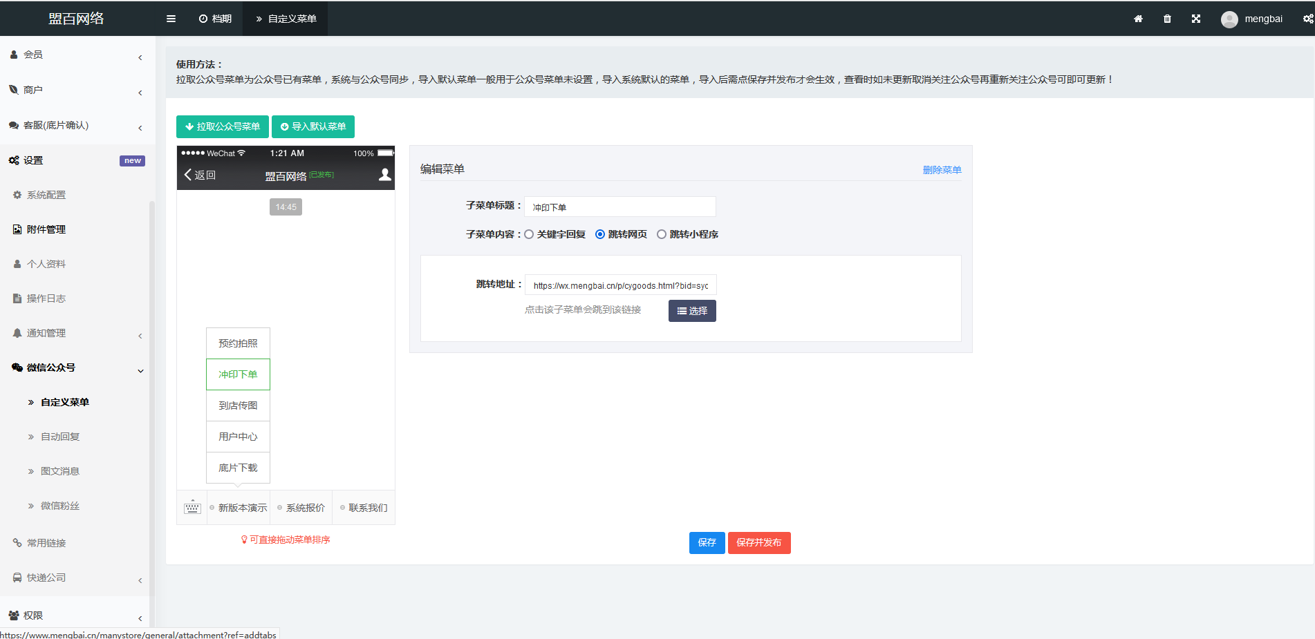 | 本次主要新增微信公眾號的后臺接入。包括拉取公眾號菜單、導入默認自定義菜單,自動回復(包括關注回復、關鍵詞匹配回復、萬能關鍵詞回復、菜單回復等),可回復表情文字鏈接、圖片、圖文、音頻、視頻、同步粉絲功能等。 / 微信公眾號接入后臺截圖 / 自定義菜單管理,可視化拖拽菜單方便編輯 自動回復管理,可設多個關鍵詞全匹配或模糊匹配。 粉絲同步 / 其它更新 / 優化獲取門店信息及排序,顧客獲取門店距離改成超過60秒才重新獲取。 以上為僅為部分功能介紹,更多的功能請到演示站體驗,聯系微信號 |